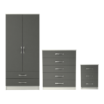 Classic clean minimalistic design. Ready made 3 part 2 door 2 drawer wardrobe set in white and grey colour. Set consists of a 2 door 2 drawer wardrobe, 5 drawer chest and a bedside. Drawers are fitted with smooth runners. Wardrobe and 5 drawer chest have castors for easy moving.