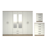 Ready assembled 3 Pcs Classic 6 door 2 Drawer Mirrored Wardrobe, Chest And Bedside Set Oak And White