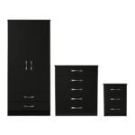Classic clean minimalistic design.  Ready made 3 part 2 door 2 drawer wardrobe set in black colour. Set consists of a 2 door 2 drawer wardrobe, 5 drawer chest and a bedside. Drawers are fitted with smooth runners. Wardrobe and 5 drawer chest have castors for easy moving.