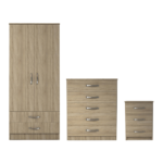 3 Pcs Classic 2 Door 2 Drawer Wardrobe, Chest and Bedside Set Oak