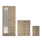 Classic clean minimalistic design. Ready made 3 part 2 door combi mirrored wardrobe set in oak colour. Set consists of a 2 door 3 drawer combi wardrobe, 5 drawer chest and a bedside. Drawers are fitted with smooth runners. Wardrobe and 5 drawer chest have castors for easy moving.