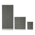 Classic clean minimalistic design. Ready made 3 part 2 door wardrobe set in white and grey colour. Set consists of a 2 door wardrobe, 5 drawer chest and a bedside. Drawers are fitted with smooth runners. Wardrobe and 5 drawer chest have castors for easy moving.
