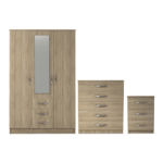 3 Pcs Classic 3 Door 3 Drawer Combi Mirrored Wardrobe, Chest And Bedside Set Oak