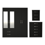 3 Pcs Classic 4 Door 2 Drawer Mirrored Wardrobe, Chest And Bedside Set Black