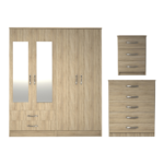 3 Pcs Classic 4 Door 2 Drawer Mirrored Wardrobe, Chest And Bedside Set Oak