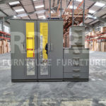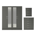 Classic clean minimalistic design. Ready made 3 part 4 door mirrored wardrobe set in grey colour. Set consists of a 4 door mirrored wardrobe, 5 drawer chest and a bedside. Wardrobe comes in 2 sections as two double parts. This setting allows items to be taken in the room of choice assembled. Each section will have a top shelf and a hanging rail. Drawers are fitted with smooth runners. Wardrobe and 5 drawer chest have castors for easy moving.