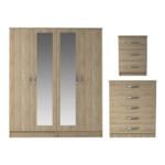 3 Pcs Classic 4 Door Double Mirrored Wardrobe, Chest And Bedside Set Oak