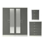 Ready assembled 3 Pcs Classic 4 Door Double Mirrored Wardrobe, Chest And Bedside Set White And Grey