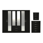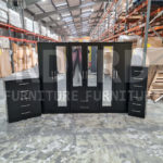 Classic clean minimalistic design. Ready made 3 part 6 door fitment with 4 mirrors set in black colour. Set consists of a 6 door 2 drawer 4 mirror wardrobe, 5 drawer chests and a bedside. Wardrobe comes in 3 sections as three double parts. This setting allows items to be taken in the room of choice assembled. Two sections will have a top shelf and a hanging rail. Middle section will have a hanging rail and 2 drawers. Drawers are fitted with smooth runners. Wardrobe and 5 drawer chest have castors for easy moving.