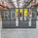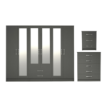 Classic clean minimalistic design. Ready made 3 part 6 door fitment with 4 mirrors set in grey colour. Set consists of a 6 door 2 drawer 4 mirror wardrobe, 5 drawer chests and a bedside. Wardrobe comes in 3 sections as three double parts. This setting allows items to be taken in the room of choice assembled. Two sections will have a top shelf and a hanging rail. Middle section will have a hanging rail and 2 drawers. Drawers are fitted with smooth runners. Wardrobe and 5 drawer chest have castors for easy moving.