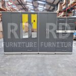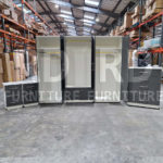 Classic clean minimalistic design. Ready made 3 part 6 door fitment with 2 mirrors set in white and grey colour. Set consists of a 6 door 2 drawer 2 mirror wardrobe, 5 drawer chests and a bedside. Wardrobe comes in 3 sections as three double parts. This setting allows items to be taken in the room of choice assembled. Two sections will have a top shelf and a hanging rail. Middle section will have a hanging rail and 2 drawers. Drawers are fitted with smooth runners. Wardrobe and 5 drawer chest have castors for easy moving.