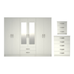 3 Pcs Classic 6 door 2 Drawer Mirrored Wardrobe, Chest And Bedside Set Whit