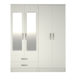 Classic clean minimalistic design. Large 4 door wardrobe with 2 drawers with smooth runners and 2 mirrors in white giving you a maximum use of your storage space. Wardrobe is supplied assembled. It comes in 2 sections as two double parts. This setting allows items to be taken in the room of choice assembled. One part will have a top shelf and a hanging rail. Other part will have a hanging rail and 2 drawers. Wardrobe comes on castors for easy transportation. Strong construction brings you real value.