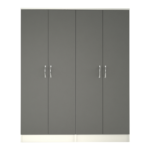 Classic clean minimalistic design. Plain 4 door wardrobe in white and grey giving you a fair use of your storage space. Wardrobe is supplied assembled. It comes in 2 sections as two double parts. This setting allows items to be taken in the room of choice assembled. Each part will have a top shelf and a hanging rail. Wardrobe comes on castors for easy transportation. Strong construction brings you real value.