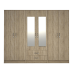 Classic clean minimalistic design. Large 6 door wardrobe with 2 drawers with smooth runners and 2 mirrors in oak giving you a maximum use of your storage space. Wardrobe is supplied assembled. It comes in 3 sections as three double parts. This setting allows items to be taken in the room of choice assembled and can also be used separately. Two parts will have a top shelf and a hanging rail. Third part will have a hanging rail and 2 drawers. Wardrobe comes on castors for easy transportation. Strong construction brings you real value.